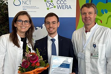Dr. Andre Karius, Postdoc und Medizinphysik-Experte in der Strahlenklinik (Direktorin: Prof. Dr. Stefanie Corradini) des Uniklinikums Erlangen, erhielt im Rahmen des Netzwerktreffens von CCC WERA und NCT WERA den WERA Publication Award 2025. Der Preis wird jährlich vom Patienten- und Angehörigenbeirat der WERA-Allianz vergeben und zeichnet wissenschaftliche Arbeiten aus, die aus Patientensicht besonders relevant für eine Verbesserung der klinischen Behandlung sind. „Es freut uns insbesondere, dass die prämierte Publikation von Patientinnen und Patienten ausgewählt wurde, also von genau denjenigen, denen wir mit unserer tagtäglichen Arbeit helfen wollen“, sagt Prof. Dr. Christoph Bert, Leiter der Abteilung für Medizinische Strahlenphysik in der Strahlenklinik.
