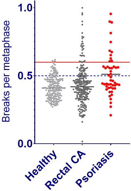 Bereits 40 Tumorpatienten mit Psoriasis sind auf ihre Strahlenempfindlichkeit untersucht worden. Mehr als die Hälfte der Patienten davon weisen eine erhöhte individuelle Strahlenempfindlichkeit auf. Mehrere Patient haben eine sehr stark erhöhte Strahlenempfindlichkeit