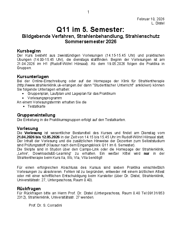 1 Februar 10, 2026 L. Distel Q11 im 5. Semester: Bildgebende Verfahren, Strahlenbehandlung, Strahlenschutz Sommersemester 2026 Kursbeginn Der Kurs besteht aus zweistündigen Vorlesungen (14.15-15.45…